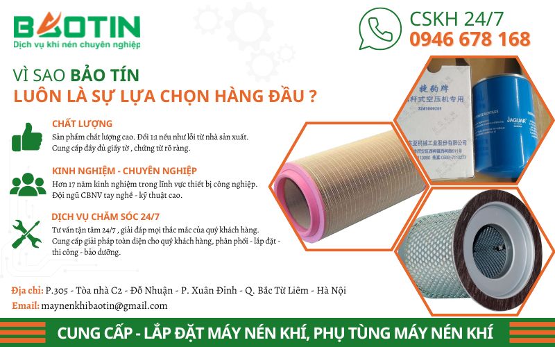 Bảo Tín là đơn vị uy tín chuyên cung cấp các loại lọc dầu, lọc gió, lọc tách dầu chính hãng cho máy nén khí Jaguar, Pegasus, Fusheng, Hitachi, Kobelco và nhiều thương hiệu khác. Với hơn 10 năm kinh nghiệm trong lĩnh vực khí nén, Bảo Tín cam kết: