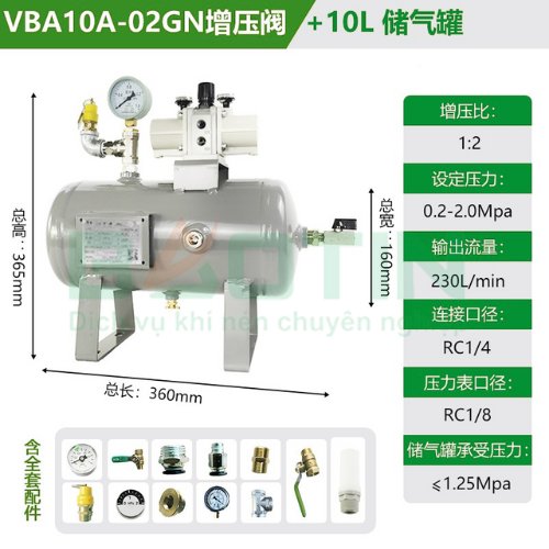 Thiết bị tăng áp VBA10A-02 hoạt động dựa trên nguyên lý khi khí nén của máy nén khí tạo ra áp suất, sẽ được đi qua bộ tăng áp, lúc này thiết bị tăng áp hoạt động và làm tăng áp suất khí nén lên.